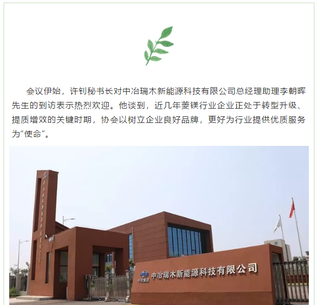 7月29日,中(zhong)冶瑞木新能源科技有限(xian)公司總(zong)經理(li)助理(li)李朝暉先(xian)生(sheng)到訪中(zhong)國菱(ling)(ling)鎂(mei)行業協(xie)(xie)會(以(yi)下簡稱“協(xie)(xie)會”),就硫酸鎂(mei)的(de)發展現狀及應用前景等問(wen)題(ti)與協(xie)(xie)會進行了探討和交流。中(zhong)國菱(ling)(ling)鎂(mei)行業協(xie)(xie)會許釗秘(mi)(mi)書(shu)長,李孟強副(fu)秘(mi)(mi)書(shu)長及秘(mi)(mi)書(shu)處在京成員參加本次座(zuo)談。